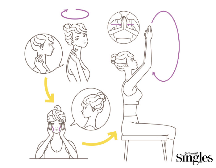 2 책상 위에 팔꿈치를 붙이고 손바닥 끝으로 턱 아래를 꾹 누른다. 턱을 광대까지 끌어올리며 원을 그렸다가 돌아온다.