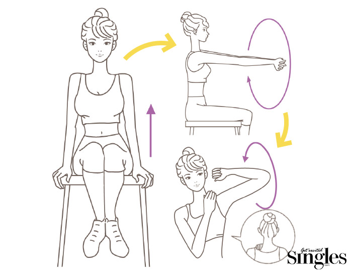 3 가슴 앞에 양손을 맞대고 안쪽으로 힘을 주면서 밀어낸다. 가능한 한 큰 원을 그리며 앞에서 뒤로 10회 돌린다.