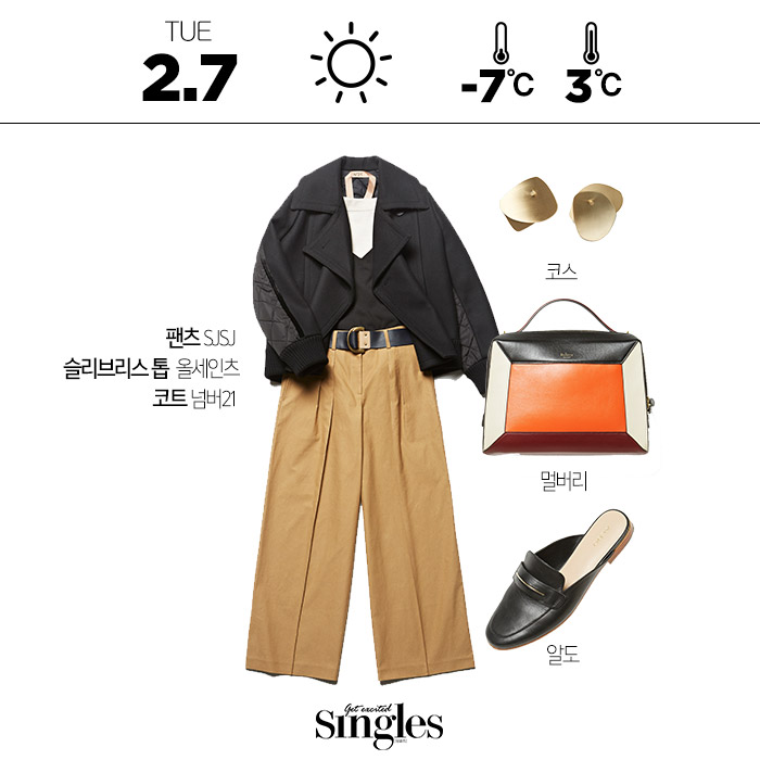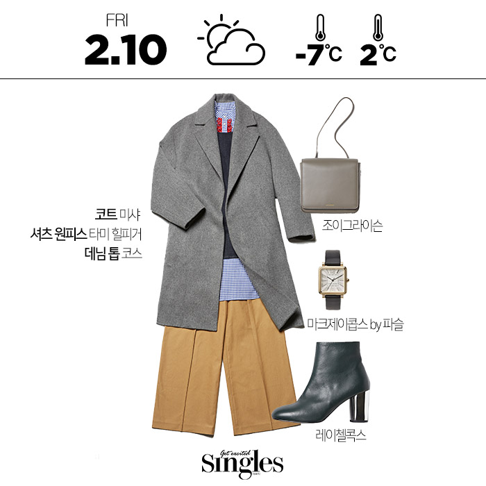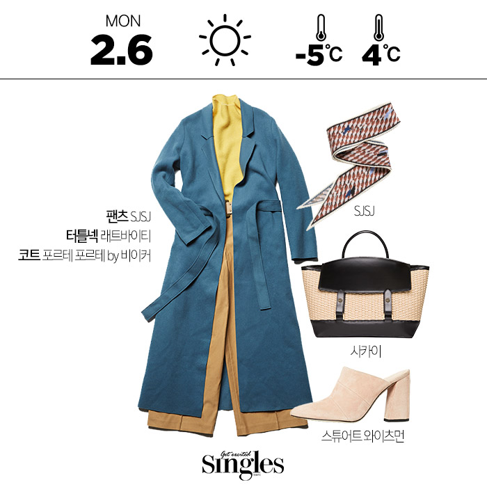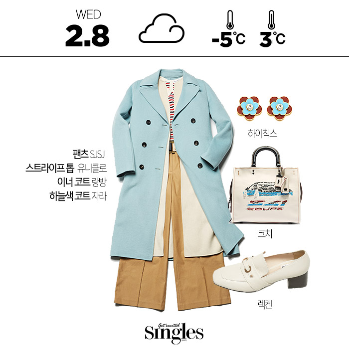 하늘색 더블 코트와 경쾌한 스트라이프 티셔츠로 밝고 경쾌하게 입은 수요일. 화이트 컬러 코트를 안에 덧입어 보온 효과와 함께 하늘색이 더욱 돋보이게 한다. 봄이 온 듯한 아이템과도 무리 없이 어울리는 와이드 치노 팬츠가 필요한 스타일링.