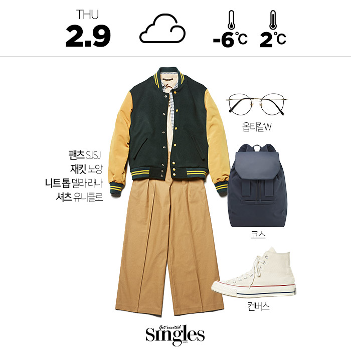 베이스 볼 점퍼 아래에 데님이라는 뻔한 공식이 지겨울 땐 세심하게 컬러를 맞춘 치노 팬츠도 좋은 선택. 귀여운 체크 셔츠를 티셔츠 위에 더해 빈티지하게 입어 볼까?