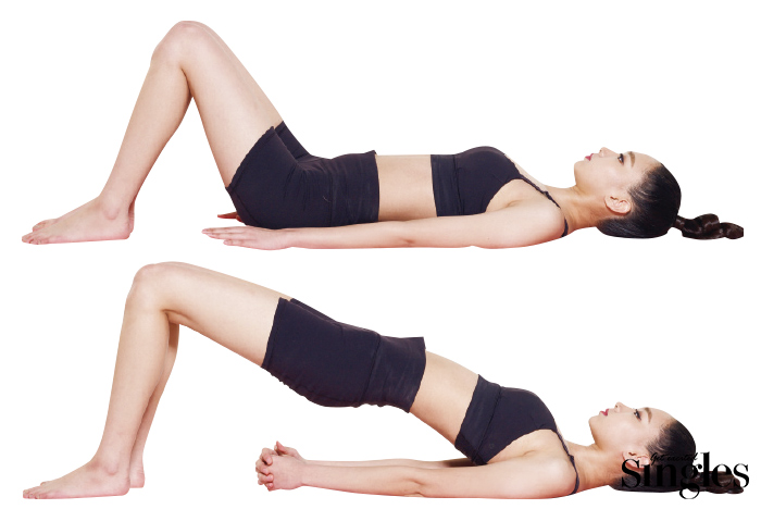 STEP 2 숨을 깊게 마시면서 골반이 하늘을 향하도록 허리를 높이 든다. 양손은 등 뒤에서 깍지를 끼고 호흡을 3~5번 쉴 때까지 유지한다.