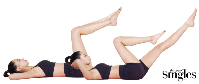 STEP 1 바르게 누운 상태에서 허리를 바닥에 바싹 붙인다. 두 발을 모으고 무릎과 엉덩이를 90도로 구부려 시작 자세를 취할 것. 이때 목과 어깨에 힘이 들어간다면 머리 밑에 베개를 놓자.
