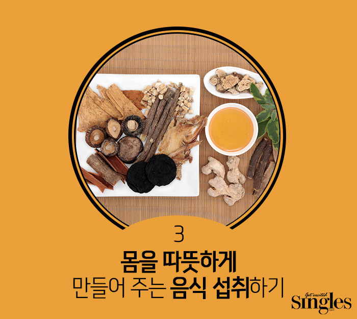 몸을 따뜻하게 만들어주는 음식에는 불포화 지방산을 함유한 어류나 식물성 지방 등이 있다. 대표적으로 연어나 고등어, 아보카도, 해바라기씨, 코코넛 오일 등이 이에 해당된다. 이 밖에도 따뜻한 성질을 띠는 생강, 대추, 쑥, 계피 등의 재료로 우린 차를 마시는 것도 도움이 된다. 우유를 마실 때 시나몬 파우더를 듬뿍 뿌려 마시면 몸이 따뜻해질 뿐만 아니라 심지어 맛있기까지 하다! 반면 피해야 될 음식은 알코올과 카페인이 포함된 음료. 특히 차가운 탄산음료는 혈관을 수축해 혈액순환을 방해하기 때문에 수족냉증이 있는 사람이라면 피하는 게 좋다.