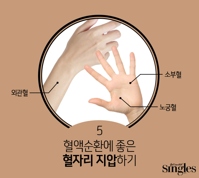 지압은 눌러줘야 할 곳을 정확하게 알기만 하면 의외로 누구나 효과를 볼 수 있는 방법이다. 혈액순환에 좋은 혈자리(외관, 노궁, 소부)를 주기적으로 마사지해보자. 외관혈은 전신의 균형을 맞춰주고, 노궁혈을 마사지하면 손바닥의 혈액순환을 도와 피로회복에 도움이 된다. 소부혈은 심장에 관련된 혈자리로 몸을 따뜻하게 해준다.