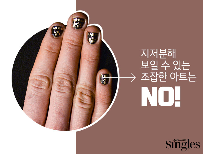 네일 보디가 작은 사람에게 이런 오밀조밀한 네일 아트는 오히려 지저분해 보일 수 있으므로 피하는 게 좋다. 네일 보디가 크고 시원시원한 경우라면 패턴 사이의 간격이나 크기 등을 조절할 수 있지만 손톱이 짧은 사람에겐 선택의 폭이 그리 넓지 않기 때문이다. 결론적으로 ‘짧은 손톱’엔 여러 컬러가 섞여 있거나 조잡한 아트는 어울리지 않는다. 단점을 더욱 부각시키게 마련이다.