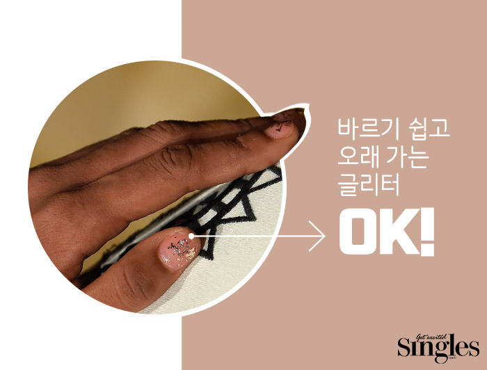 네일리스트 윤지희는 짧은 손톱에 가장 잘 어울리는 아트로 ‘글리터’를 꼽았다. 그간 수많은 테스트를 통해 내린 결론이다. 속이 비치는 ‘시스루 네일’이나 ‘그러데이션 네일’, ‘둥근 프렌치 네일’ 등도 짧은 손톱에 했을 때 제법 잘 어울리는 것들이 있지만 그 중에서도 제일은 ‘글리터 네일’이라고. 지속력이 강하고 따라 하기도 쉬워 ‘셀프 네일’로도 합격! 손톱 가득 채워 바르는 것보단 위 사진처럼 중앙이나 끝부분 위주로 바르면 상큼함을 더할 수 있다.