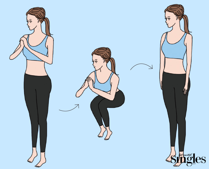 두 무릎을 붙인 채 하는 스쿼트로 허벅지 전체 근육을 자극해 다리 군살 제거에 효과적이다. 다리를 완전히 모을수록 허벅지 바깥쪽에 자극을 줘 승마살이 고민인 사람에게 추천.