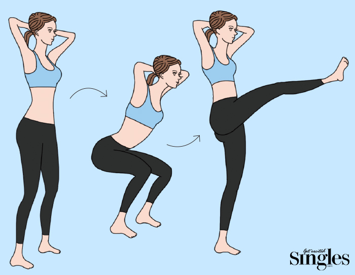 스쿼트 자세에 앞으로 킥 동작을 더했다. 엉덩이 근육 전체를 자극해 애플힙을 만들어주는 동시에 앞으로 발을 차는 동작이 복부지방 제거를 도와 복근을 만들어준다.