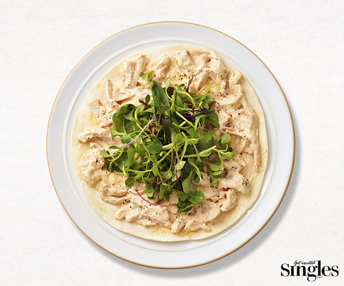 크림소스와 피자 치즈, 토르티야가 들어간 고칼로리 요리가 부담스러운 싱글을 위해 다이어트용 닭가슴살과 채소를 듬뿍 올렸다. 어린잎 채소는 건강뿐 아니라 비주얼 상 요리의 완성도를 높여준다. 건강한 술안주를 표방한 이 요리의 또 다른 강점은 소스에 따라 발전시킬 수 있는 방법이 무궁무진하다는 점. 크림 파스타 소스는 토마토, 커리 등 치즈와 잘 어울리는 어떤 소스를 발라도 무관하다. 토르티야에 서로 다른 소스를 반씩 바르면 하나의 요리로 두 가지 이상의 맛을 즐길 수도 있다.