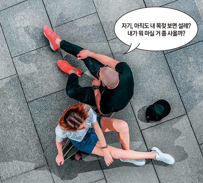 친구와 친구의 썸남은 죽이 잘 맞았다. 왁자지껄 흥겨운 분위기에 여러 명이 함께 어울리는 걸 좋아했고, 친구의 절친인 나와 썸남의 절친이 엮여 한자리에 불려 나오는 건 둘이 만날 때부터 예고된 일이었다. 그리고 어느 날, 썸남이 보증한 ‘좋은 남자’와 함께 4명이 술자리에서 어울리게 됐다. 사실 나가기 전에는 친구들이 이야기한 “남자가 ‘좋은 남자’라고 치켜세우는 사람 중에 여자에게도 좋은 남자 역할을 하는 매력적인 사람은 없다”는 말이 떠올랐지만, 속아도 본전이란 생각을 했다. 하지만 이게 웬걸. 꽤 괜찮은 남자가 나온 것! 새내기 시절에도 술 대신 콜라만 마셔 빈축을 샀던 내가 ‘병뚜껑 치기, 업다운, 랜덤 게임’으로 이어지는 술자리 게임 3종 세트도 마다하지 않았다. 그와 단순한 친구의 친구 사이를 넘어서고 싶은 욕심이 있었다. 게다가 주변의 분위기도 훈훈했다. 게임이 계속되자 벌주로 마시는 양이 늘고, 결국 한계 주량에 근접했다는 게 느껴졌다. 그도 낌새를 챘는지 “ 씨 술은 이제 제가 다 마실게요”라며 흑기사를 자처한 것. 한 잔, 두 잔, 석 잔… 꿀꺽꿀꺽 술을 마시는 모습을 보며 나는 눈이 멀었다. 내 술을 달게 삼키던 그 빛나는 목젖. 호쾌한 목 넘김에 반해 연애 시작한 사람, 아직은 나 말곤 못 봤다.