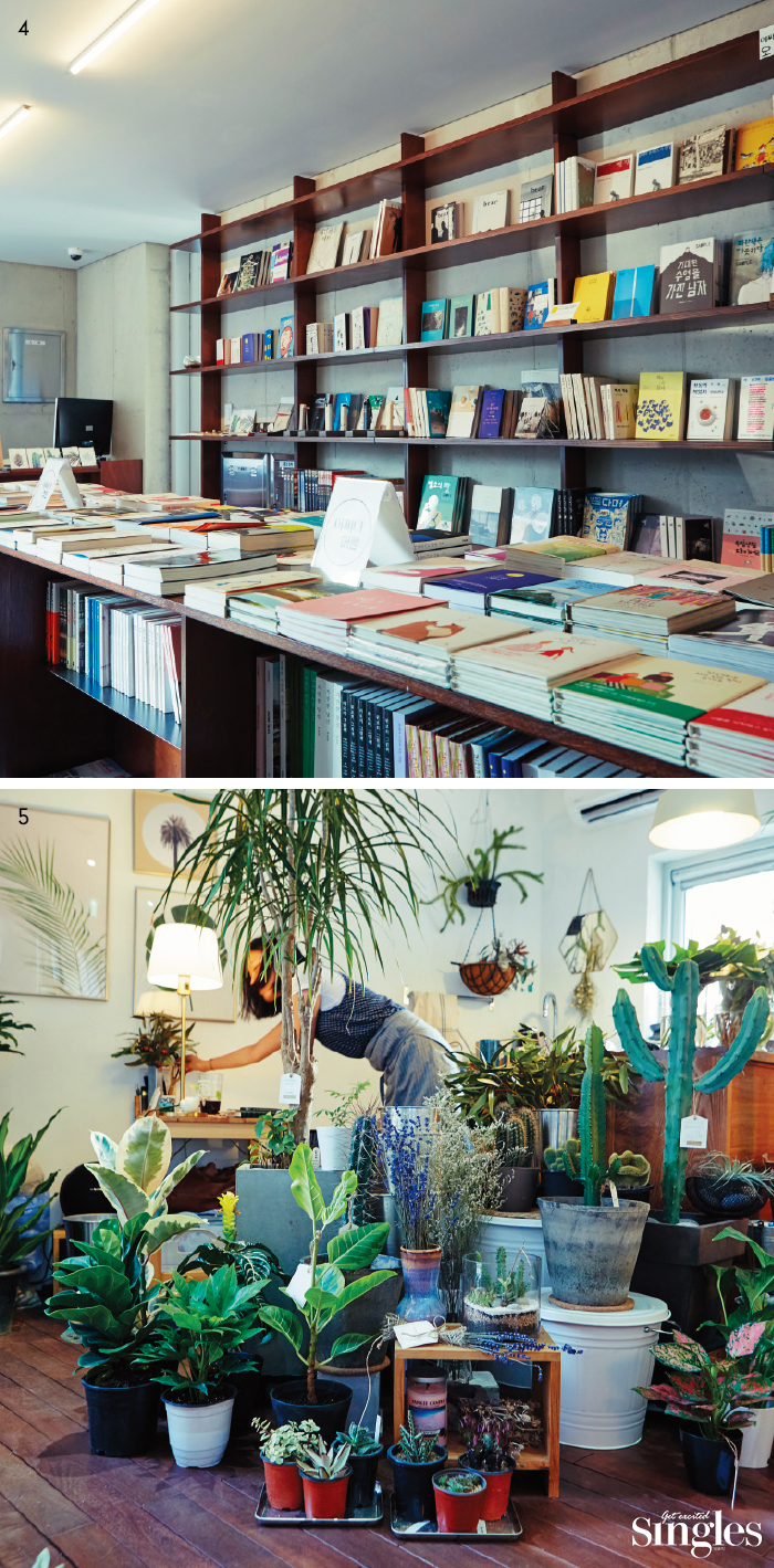 세입자는 SNS로 공개 모집했다. 오랫동안 대화를 나누며 어쩌다가게 망원에 어울리는 사람들을 찾았다. “한 공간에 함께 모여서 지내는 것에 부담이 없는 사람들을 찾았어요”라는 안 대표의 이야기에 건물을 직접 설계한 사이건축사무소 박 대표가 “건물을 설계하며 몇 군데는 이런 업종이 들어오면 좋겠다고 생각하기는 했어요”라고 덧붙인다. 대표적인 예가 입구의 꽃집 ‘슬로앤스테디’다. “입구에서부터 예쁜 것을 보면 기분이 좋잖아요”라는 부연 설명과 함께 설계할 때부터 카페와 서점이 함께 들어오길 바랐다는 이야기를 한다.