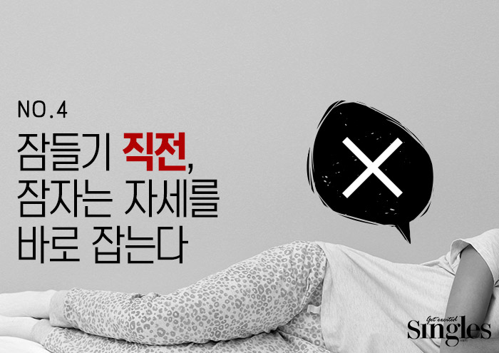 사람마다 알게 모르게 잠자는 자세가 습관처럼 굳어있다. 한의사 김담희에 따르면 가장 최적의 수면 자세는 ‘똑바로 누워 자는 것’이다. 다른 자세들은 자칫하면 몸의 순환을 막아 부종은 유발할 수 있기 때문이다. “부종이 당장 살이 되진 않죠. 하지만 체내 순환이 잘 안 돼서 부은 것이 오래가면 지방이 쌓이는 데에도 영향을 줘요.” 한의사 김담희의 무시무시한 경고다. 부은 것을 그대로 내버려두면 결과적으로 살이 찐다니! 특히 엎드려 자거나 한 방향으로만 누워 자는 습관을 가졌다면 오늘부터라도 자세를 바로 잡을 것. 한의사 최혁준은 똑바로 자도 쉽게 붓는 사람들에게는 다리 밑에 높은 베개를 두고 잘 것을 추천한다. 다리를 심장보다 높게 두면 정맥이 심장으로 피를 보내는 데 보다 도움이 된다.