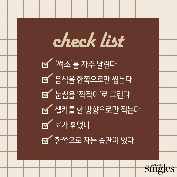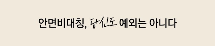 위의 체크리스트 중 하나에만 해당해도 안면비대칭을 의심해볼 수 있다. 한쪽 입꼬리나 눈썹이 올라가거나 한쪽 턱이 비대칭적으로 발달했을 가능성이 있기 때문. 거울을 봤을 때는 멀쩡하지만, 남에게 찍힌 사진을 보면 영 낯선 얼굴이라고? 그런 경우에도 역시나 안면비대칭이 범인이다. 그간 거울을 보고 수평을 맞추며 양쪽 눈썹을 똑같이 그린다고 생각했던 에디터는 얼굴을 촬영한 영상을 보고 경악할 수밖에 없었다. 양쪽 눈썹산의 각도가 눈에 띄게 달랐기 때문. 심지어 양쪽 얼굴의 이미지도 달라 보이는 것이 아닌가? 그러고 보니 꽤 오랫동안 왼쪽 45도 각도로만 셀카를 찍고 있었다… 안면비대칭 교정에 대한 수소문을 시작한 건 그때부터였다.