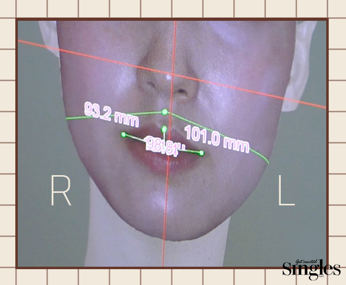 먼저 인중에서 구레나룻까지의 길이를 잰다. 그런 다음 입술산과 입꼬리의 각도를 잰다. 이 값들은 양쪽 얼굴의 비대칭 정도를 나타낸다. 에디터의 경우 왼쪽 얼굴이 더 넓었고, 오른쪽 얼굴은 라인이 울퉁불퉁한 것을 확인할 수 있었다. 입술 비대칭 정도는 생각보다 심하지 않았다.
