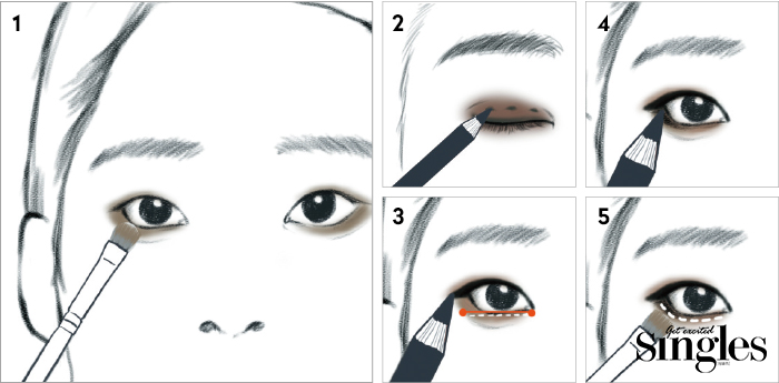 1 옅은 오렌지, 브라운 섀도를 눈 떴을 때 보일 정도로, 언더라인 부분에 연결되게 펴 바른다.