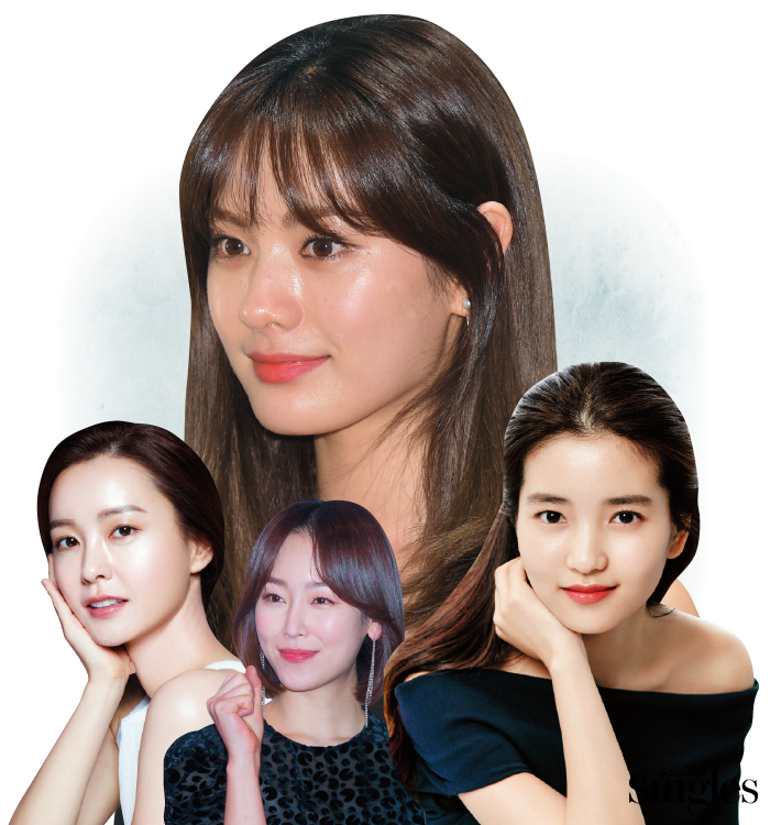 ‘얼굴에 각이 있어서 확실히 우아해 보이는 것 같아요.’ 작년 박찬욱 감독의 영화 <아가씨>로 대중에게 각인된 배우 김태리의 화보 기사마다 이런 댓글이 달린다. “자연스러운 얼굴에서 나오는 우아하고 생기 있는 이미지 덕에 계속해서 브랜드 뮤즈로 기용하고 있어요.” 클라란스 홍보팀 김수정 대리의 이야기 역시 그 궤를 같이한다. 그런 만큼 ‘각이 있는 얼굴’이 평범하지 않은 미인의 한 조건으로 대두되고 있다. 얼굴 각에서 나오는 자연스러움이 사랑스러움을 배가시키는 정유미와 각이 있어 고급스러워 보인다는 애프터 스쿨의 나나 역시 마찬가지. 나나를 담당하는 제니하우스의 청담힐점의 무진 부원장은 볼에서 턱 쪽으로 베이스를 사선으로 발라 얼굴 각을 가리려 하기보다 적당히 부각시켜 오히려 세련되게 보이게 하는 데 중점을 둔다고 한다.