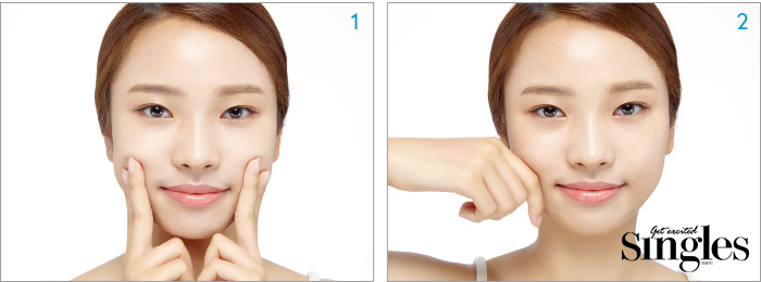 2 손가락으로 얼굴의 움푹 파인 부분을 눌러준다.