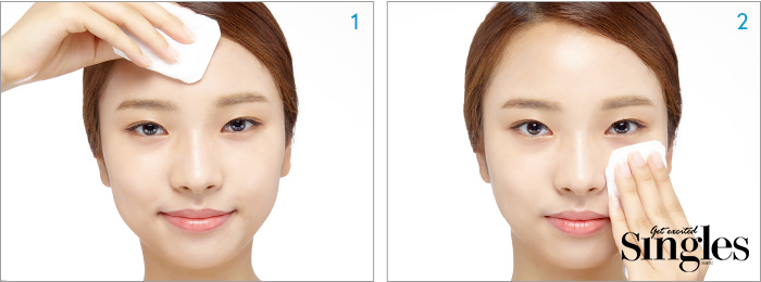 1 미스트 분사 후 이마-코-볼 순으로 화장솜으로 피부결대로 닦아준다.