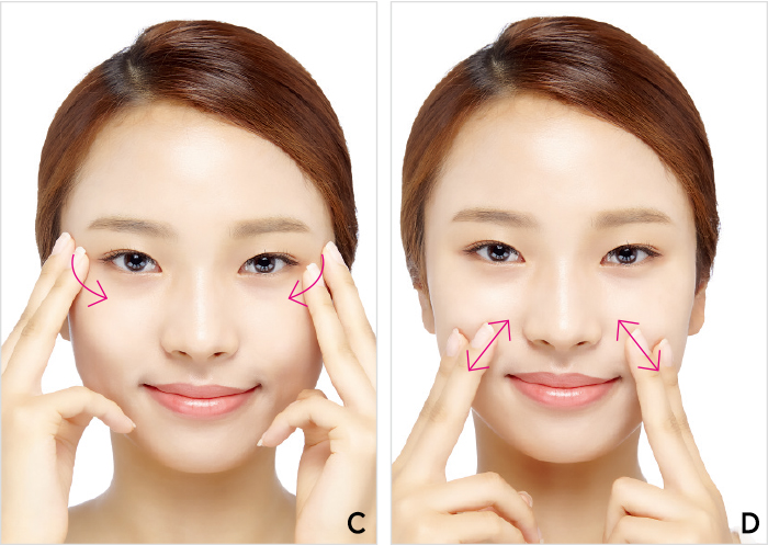 D 검지와 중지를 팔자주름에 세로로 밀착시켜 꾹꾹 누르면서 바른다.