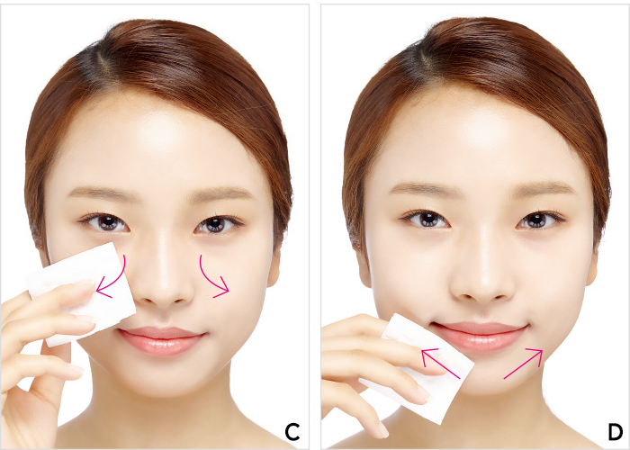C 화장솜을 손가락 안쪽으로 말아 이마와 코 옆을 가볍게 닦아낸다. 코 옆의 굴곡진 부분은 좀 양옆으로 좀더 꼼꼼히 닦아낸다.
