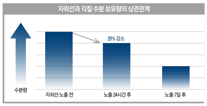강한 자외선을 받으면 24시간 후 표피의 수분량이 20%나 감소한다. 자외선을 받는 시간이 길어질수록 표면은 점점 건조해지고 뻣뻣해진 각질이 피부에 쌓이게 된다. 여름철 모공 케어와 각질 케어가 함께 언급되는 건 바로 이 때문이다. 피부의 턴오버 작용이 다른 계절에 비해 활발하게 일어나지 못하니 탈락해야 할 각질이 제때 탈락하지 못해 피부 표면에 각질이 쌓이는 것. 노폐물은 제대로 배출되지 못하고 그로 인해 트러블은 계속 악화된다. 평소 일주일에 1~2회 각질 케어를 했다면 여름에는 그 빈도수를 높여 각질을 더 자주 관리해주어야 한다. 자극적이지 않은 제품을 사용해야 하는 건 당연지사. 바르는 것만으로 각질을 케어할 수 있는 글루코노락톤 성분을 함유한 크림을 자기 전에 도톰하게 바르는 걸 추천. 거기에 피부 속 콜라겐 생성을 촉진시키는 성분을 추가해 흐물해진 피부에 탄력을 더하자.