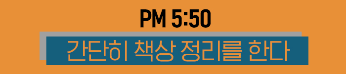 퇴근할 시간이 되면 사무실 책상은 각종 자료, 서류 등으로 정신이 없다. 퇴근 전에 필요한 물건과 불필요한 물건을 구분해 정리해야 한다. 책상 위가 지저분하면 물건을 찾는 데 시간을 허비한다. 불과 몇 초일지라도 그 짧은 시간이 모이면 큰 차이를 만든다. 버리기 애매한 서류는 휴대폰으로 찍어둘 것.