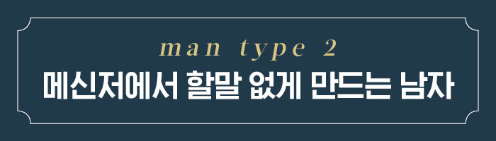 장거리 커플이라 연락이 중요한 관계라면 힘들겠지만 이 남자와의 메신저 대화에 크게 의미를 부여하지 말자. 그는 그저 스마트폰과 친하지 않은 성향을 가진 사람일 뿐이다. 건조한 그의 메시지가 거슬린다면 슬쩍 이모티콘을 선물하는 것도 방법. 문자보다는 전화를, 전화보다는 얼굴 보는 시간을 늘리면 더욱 단단한 관계로 발전할 수 있는 확률이 높다. 그를 향한 마음이 꽉 차지 않았더라도 당장 이별을 고할 필요는 없다.