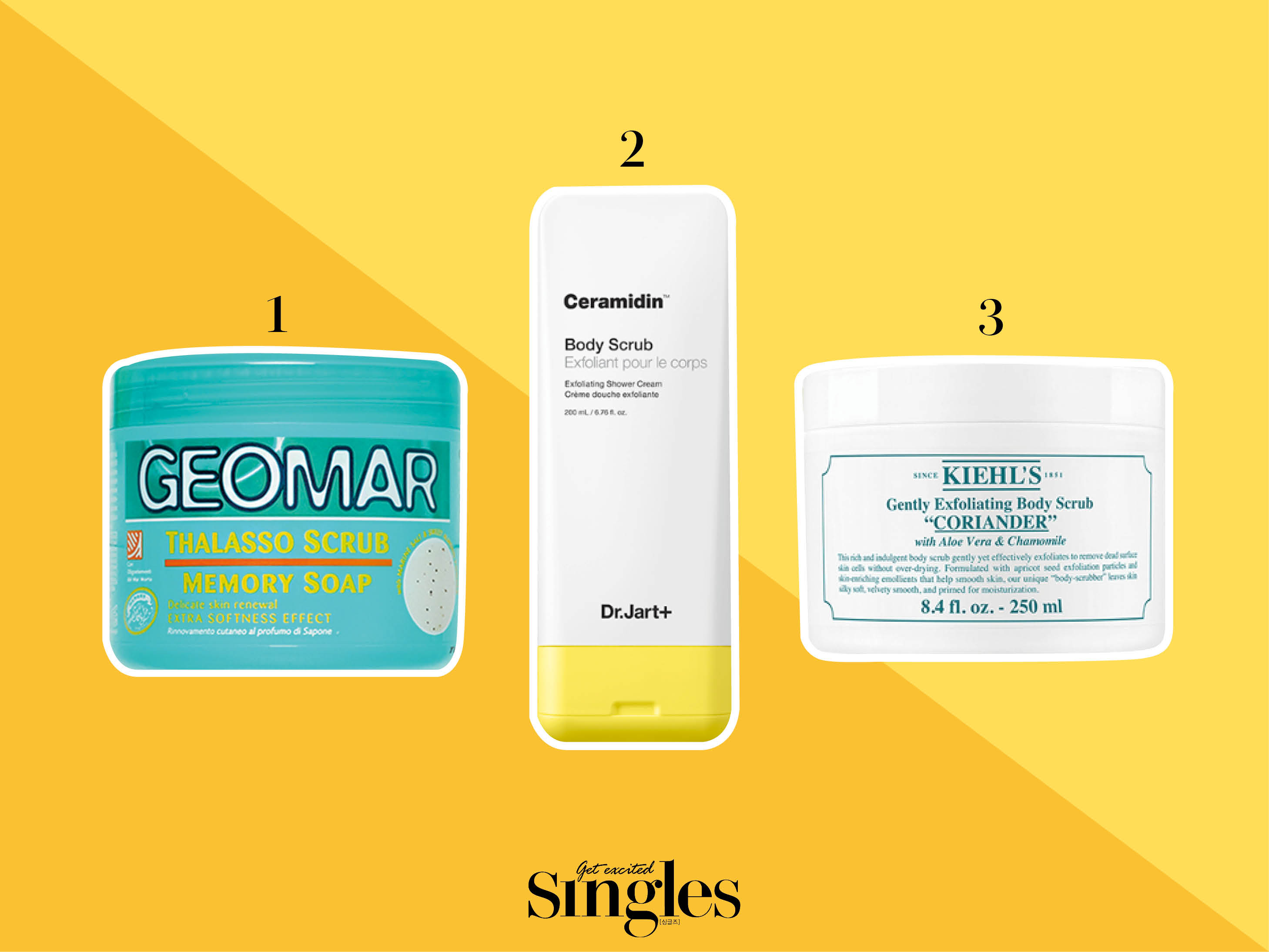 1. 지오마 메모리 솝 바디 스크럽 3만8000원 2. 닥터자르트 세라마이딘 바디 스크럽 2만 4000원 3. 키엘 젠틀 바디 스크럽 4만2000원