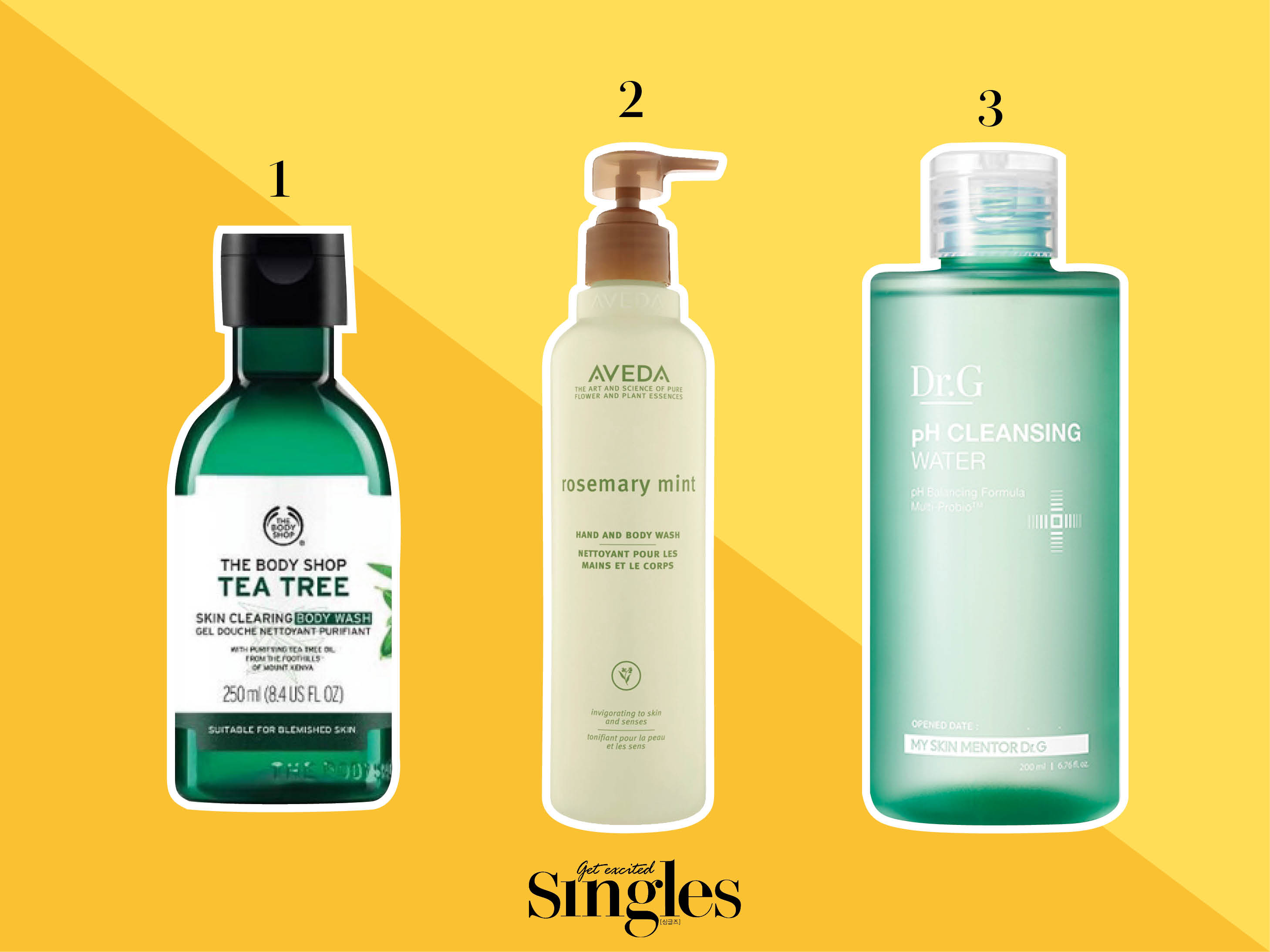 1. 더바디샵 티트리 스킨 클리어링 바디 워시 1만4500원 2. 로즈메리 민트 핸드 앤 바디 워시 2만80000원 3. 닥터지 약산성 클렌징 워터 2만2000원