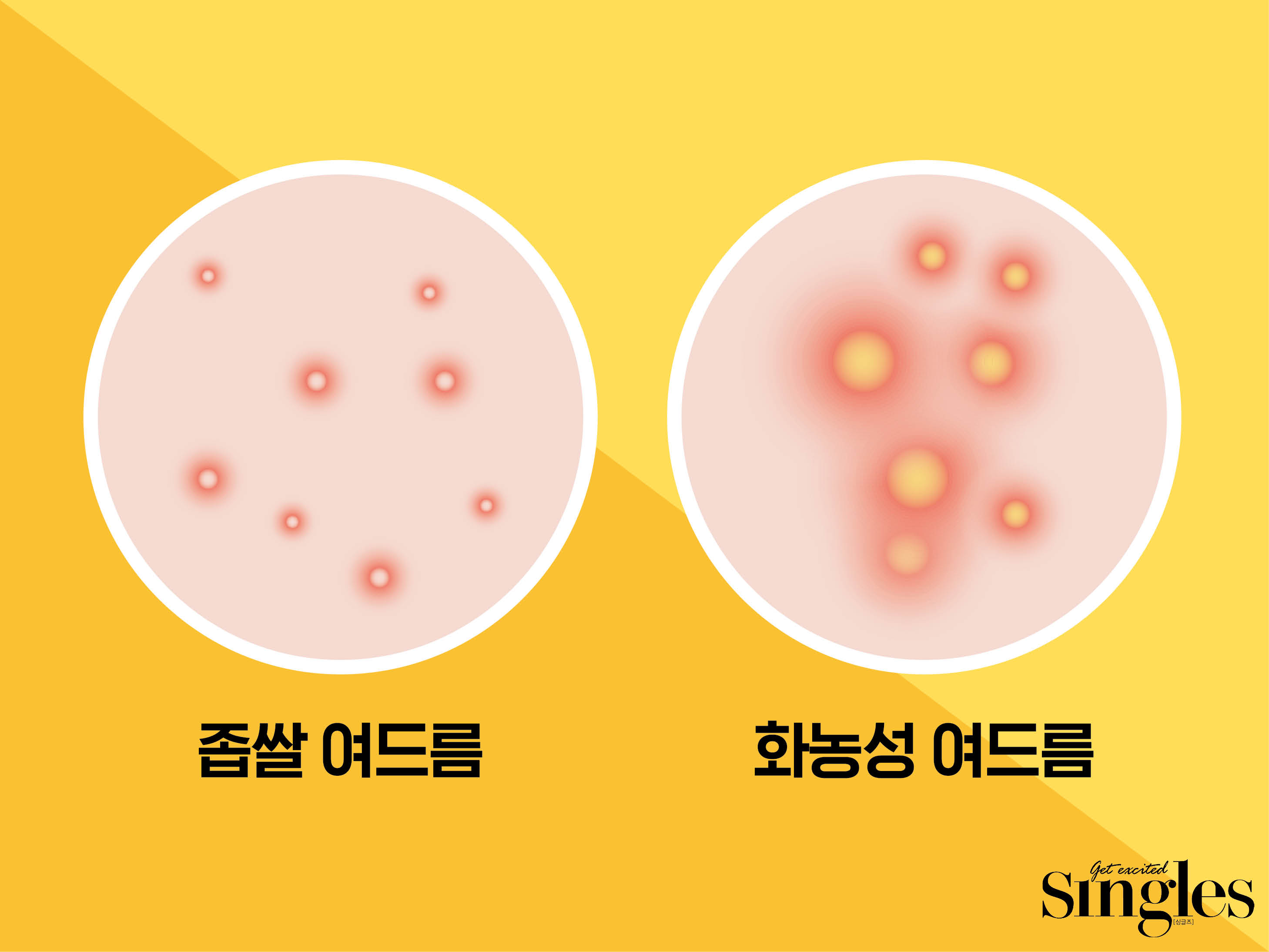 등드름은 크게 좁쌀 여드름, 화농성 여드름으로 나눌 수 있다. 좁쌀 여드름은 등드름 초기 단계로 모공 벽의 각질층이 두꺼워져 노폐물이나 피지가 제대로 분비되지 못하고 안에서 쌓인 것이다. '닥터 손유나'의 손유나 원장은 “좁쌀 여드름은 등 외에도 이마, 볼, 턱 가슴 위 등 피지선이 발달한 곳에 주로 생깁니다.”라고 설명했다. 화농성 여드름은 모낭 속에 세균이 증식해 피부에 염증과 고름을 일으킨 것이다. 처음에는 붉은 발진이 올라오다가 조금씩 사라지는 경우가 있다. 하지만 사라진 곳에 붉은 자국이 남을 수 있고 심할 경우 염증성 여드름으로 악화 될 수 있다.