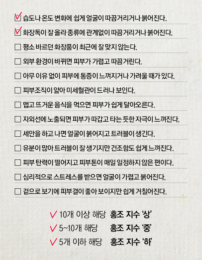 가을이 되면 홍조가 더욱 심해지는 것은 두말할 필요 없이 일교차 때문이다. 아침과 저녁의 기온차가 큰 데다 밤이 되면 찬 바람이 불고 혈액순환까지 원활하지 못하니 피부는 더욱 민감해진다. 피부가 얇고 투명한 타입이거나 알레르기 때문에 스테로이드 연고를 많이 사용한 사람도 이맘때가 되면 볼이 더욱 붉어진다.