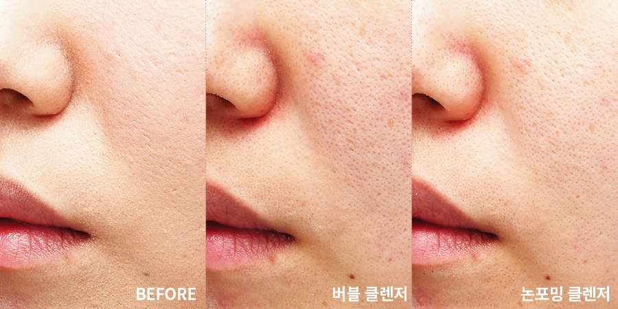 결과 같은 양을 덜어 세안했음에도 논포밍 클렌저의 경우 모공 사이사이의 메이크업 잔여물 제거는 물론, 코와 입 옆쪽에 끼인 각질까지 한 번에 정돈됨을 확인할 수 있었다. 또한 촉촉하고 피부에 자극이 적은 약산성 젤 텍스처가 세안 직후의 속땅김을 개선하고 세안 시의 피부 자극을 줄여 즉각적으로 밝아진 피부톤까지 경험할 수 있었다.