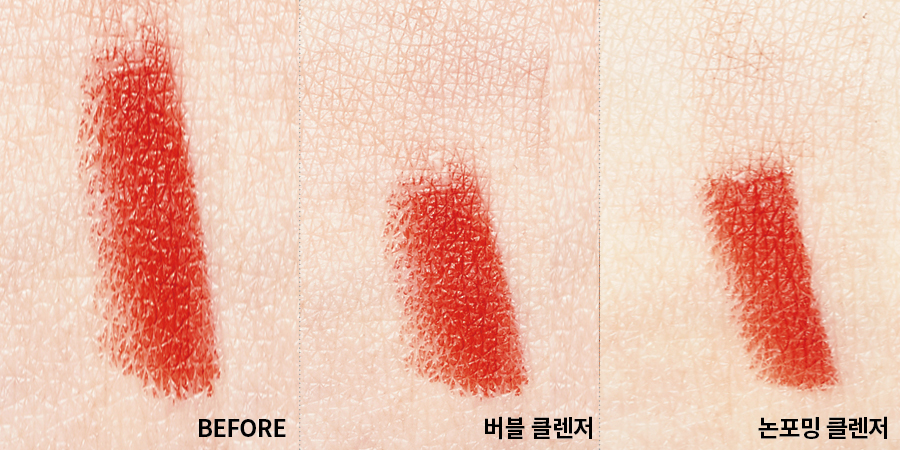 실험 방법 착색이 심한 립스틱을 손등에 바른 다음 버블 클렌저와 논포밍 클렌저 모두 동일한 양을 덜어 닦아봤다. 손등에 남아 있는 립스틱 자국이 적을수록 세정력이 높다.