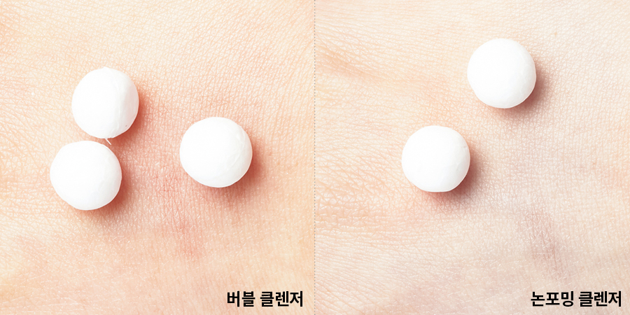 실험 방법 동일한 양의 버블 클렌저와 논포밍 클렌저로 손등을 롤링한 뒤 수건으로 가볍게 닦아냈다. 그 후 스티로폼공이 얼마나 달라붙는지 확인했다. 손등에 붙은 스티로폼의 개수가 적을수록 끈적임이 덜하다.