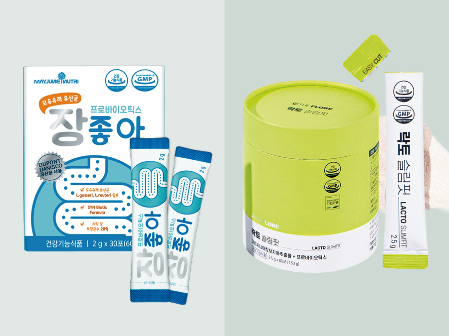(좌)메이준 뉴트리 모유 유래 유산균 장좋아 모유 유산균 2종을 함유해 장내 유익균 증식을 도와 장내 환경을 바꿔준다. 30포 2만9800원.