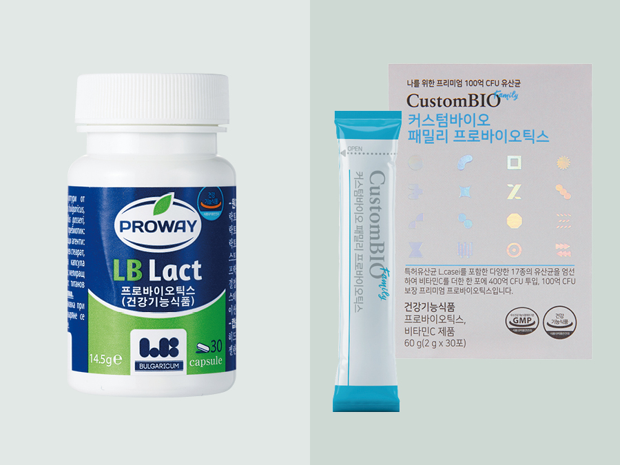 (좌)락토몰 엘비락트 모유 유산균 락토바실러스 가세리와 유산균 4종 배합으로 유산균을 증식하고 유해균 억제를 돕는다. 30정 5만9000원.