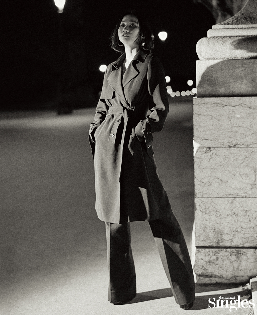 트렌치코트 프론트로우 by W컨셉 29만8000원, 팬츠와 슈즈 모두 지방시 가격미정, 이어링 브릴피스 24만8000원.