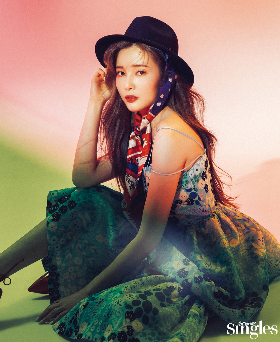 톱, 스커트 모두 티백, 슈즈 슈츠, 헤어밴딩 스카프 비비안 웨스트우드, 페도라 포에지담, 액세서리 클레모아.