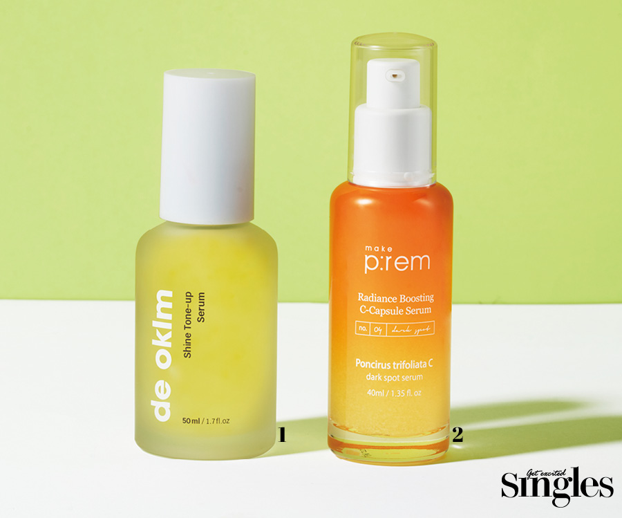 1 드오캄 샤인 톤업 세럼 비타민 캡슐이 함유된 탱글한 투명 젤 제형이 겉돌지 않고 쏙 스며든다. 비타민 콤플렉스를 담은 캡슐이 롤링 시 터지는 방식으로 보다 신선한 비타민을 피부에 공급한다. 50ml 2만1000원.