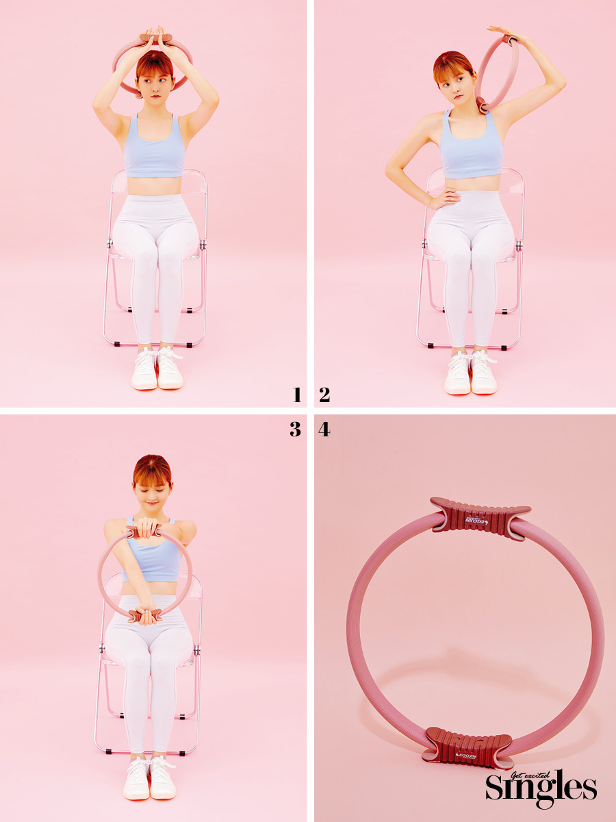2 필라테스링을 승모근에 대고 누른 상태로 앞뒤로 움직인다. 승모근을 자극해 뭉친 어깨 근육을 부드럽게 푼다.