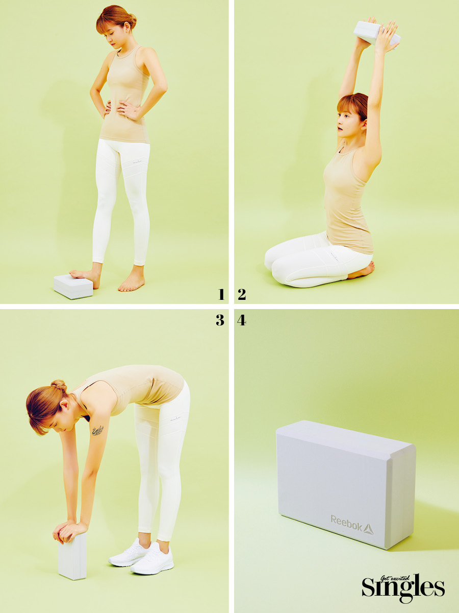 3 햄스트링을 늘리면서 몸의 뒷면 근육을 푼다. 두 발을 겨드랑이 너비만큼 벌리고 선 다음 블록을 발보다 20cm 정도 앞에 두고 잡는다. 등이 말리면 허리에 무리를 줄 수 있으니 허리를 꼭 펴야 한다.