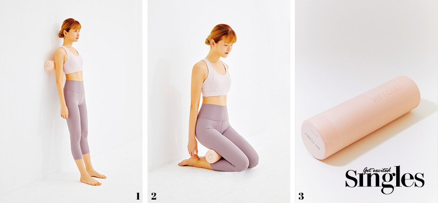 1 폼롤러와 벽을 이용해 스쿼트와 등 마사지를 한 번에 할 수 있다. 체중이 발바닥 전체에 골고루 실리도록 하고 등을 폼롤러에 기대는 느낌으로 체중을 싣는다. 시선은 정면을 바라볼 것.