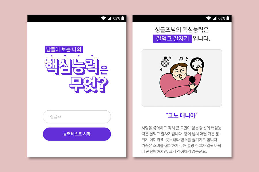 셀럽들이 인스타그램에 인증샷을 릴레이로 올려서 실시간 검색어까지 올랐던 심리테스트가 있다. 남들이 보는 나의 핵심능력을 확인할 수 있는 ‘나의 핵심능력 테스트’다. 문항은 총 12개로, “생각을 표현할 때 나는~”, “나와 의견이 다른 사람에게 반박할 때 나는~” 등 주어진 상황에 양자택일로 자신의 행동을 선택하기만 하면 된다. 테스트를 모두 완료하면 눈치 보기, 기웃거리기, 뼈 때리기 등 남들이 보는 나의 핵심 능력을 알려주며 이와 더불어 추가 능력 3가지와 내 능력이 빛나는 공간 등도 추천한다.