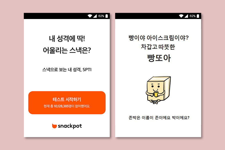 카카오톡 단톡방에서 너도 나도 한 번씩 꼭 해보라고 권유하는 심리테스트가 있다. 바로 과자로 알아보는 성격 유형 검사, ‘스낵팟 테스트’다. 이미 천만 명이 넘게 테스트 할 정도로 인스타그램 스토리가 인증샷으로 가득 찼을 정도다. 테스트 방법은 간단하다. 일상에서 일어날 법한 상황을 제시하면, 그 상황에 맞는 나의 행동을 선택하기만 하면 된다.