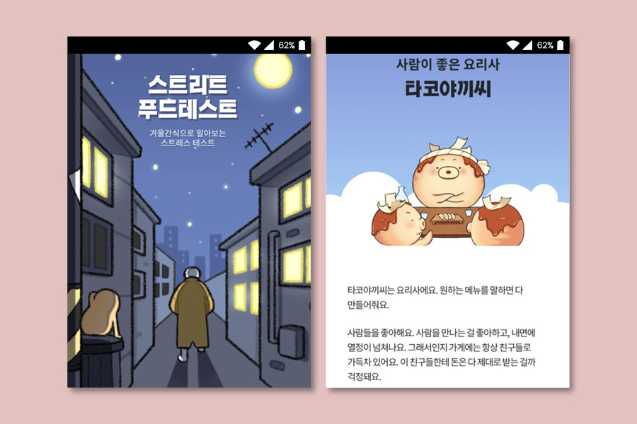 겨울 간식으로 자신의 스트레스 지수를 확인할 수 있는 심리테스트가 있다. 바로 ‘스트리트 푸드테스트’다. 테스트는 쓸쓸한 퇴근길이라는 상황극이 주어지고, 갑자기 ‘고굼이’라는 캐릭터를 만나 대화를 시작하게 된다. ‘고굼이’가 건네는 질문에 답변을 선택하면 찐빵, 계란빵, 붕어빵 등 나와 잘 어울리는 소울메이트 겨울 간식을 확인할 수 있다. 또한, 스트레스를 해소하기 위해서 어떤 일을 하면 좋을지 솔루션까지 제공한다.