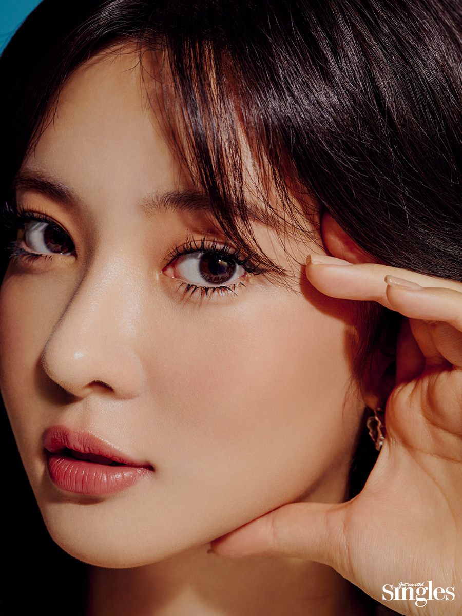 따뜻한 베이지 톤의 섀도를 눈가에 발라 음영감을 넣는다. 눈매를 또렷하게 잡아줄 수 있도록 블랙 컬러의 리퀴드 라이너로 점막을 꼼꼼히 채운다. 눈꼬리는 쌍꺼풀 라인을 따라 자연스럽게 올려 그리고 눈매가 길어 보일 수 있도록 인조 속눈썹을 세 가닥 정도 연이어 붙인다. 마스카라를 언더 래시에도 여러 번 덧발라 위 아래로 풍성한 속눈썹을 연출한다. 톤 다운된 핑크 컬러를 립과 치크에 옅게 터치해 혈색을 더한다.