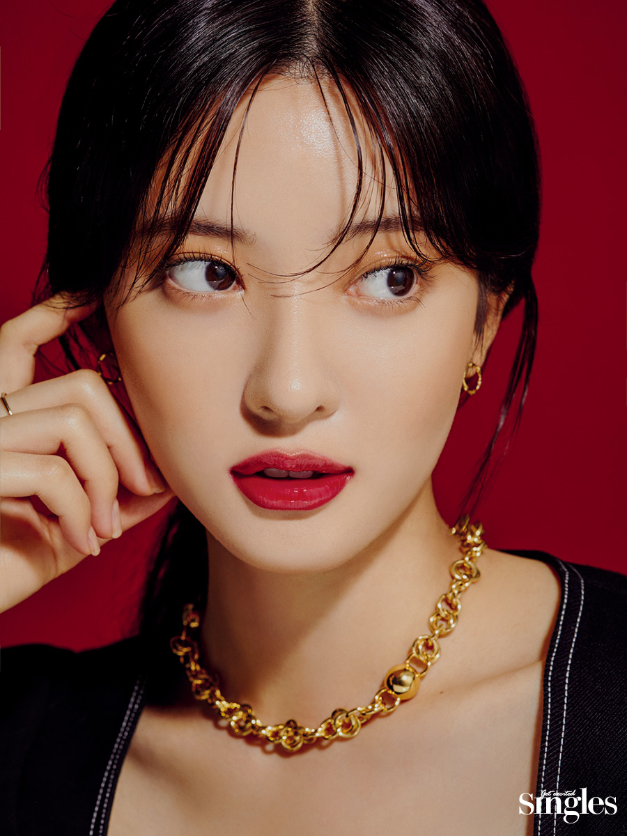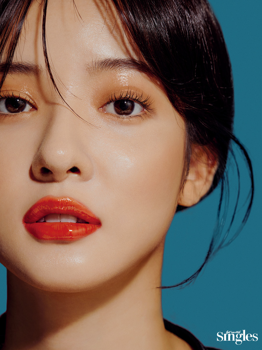 브라운 컬러의 크림 섀도를 눈가 전체에 베이스로 펼쳐준다. 딥한 브라운 섀도를 눈꼬리와 언더라인 삼각존에 더해 깊이감을 강조한다. 투명한 글로스를 아이홀에 과감하게 얹은 뒤 손가락으로 두드리며 펴 바른다. 체리를 한입 베어 문 듯한 탱글한 입술은 레드 컬러의 글로스를 라인을 따라 가득 채워 완성한다. 촉촉한 제형의 하이라이터 스틱을 이마와 콧대에 롤링해 고급스러운 광을 연출한다.