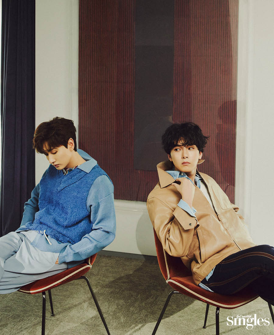 은혁 니트와 팬츠 모두 오라리 by 비이커, 베스트 아더에러, 이너 티셔츠 폴스미스. 려욱 재킷과 니트, 셔츠 모두 토즈, 팬츠 폴스미스.