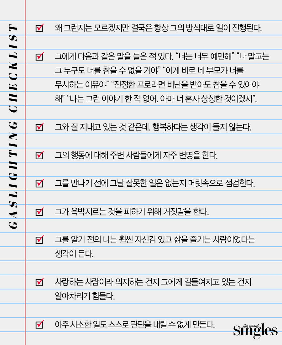 겉으로 보기에 아무런 문제가 없는 가스라이팅은 스스로 가스라이팅 피해자라는 것을 알아차리기 어려운 것이 현실이다. 자존감을 잃지 않고 건강한 연애를 지속해나가기 위해서는 스스로 자신의 관계를 점검해볼 필요가 있다. 자가진단을 위해 로빈 스턴이 언급한 가스라이팅 체크리스트도 소개한다.