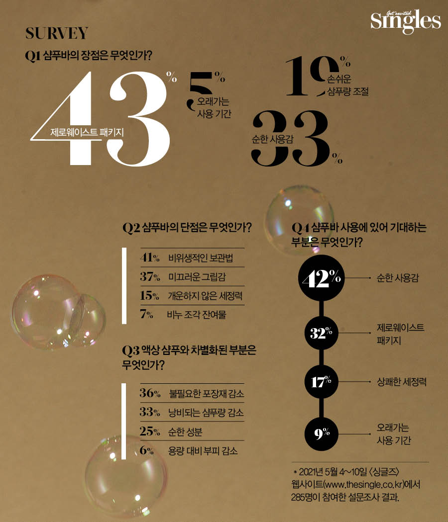 실제로 <싱글즈> 설문조사에 참여한 샴푸바 사용자 중 43%가 제로웨이스트 패키지를 장점으로 꼽았다. 대부분의 샴푸바는 기본적으로 불필요한 패키지를 줄이는 데 집중했지만 성분 또한 착하다. 톤28의 정마리아 대표는 “고체 뷰티는 방부제 없이도 제품을 빚어낼 수 있다는 점이 장점이죠. 샴푸바 역시 환경과 피부에 유해한 성분을 대체할 수 있는 저자극 성분만을 담아 완성했어요”라고 말하며 샴푸바의 순한 성분에 대해 강조한다. 물론 샴푸바 이면에는 불편한 사용감이라는 단점도 존재한다. 샴푸바 사용자 중 41%가 비위생적인 보관법을, 37%가 미끄러운 그립감을 단점으로 꼽았다.